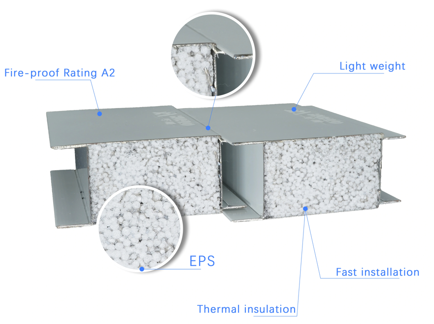 EPS clean room wall panel is a light weight building panel made from two outer layers of steel plates and a inner layer of polystyrene, which are then heated and pressurized by computer controlled color steel forming machine. It is an integration of load-bearing, heat insulation, fireproof, waterproof, and also finishing free.
